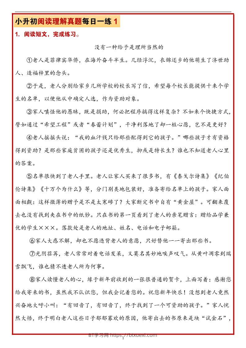 历年语文小升初阅读理解真题每日一练超级管理员25年5月21日发布关注私信04017 ——预览已结束,还剩141页未读——开通会员后可免费下载高清完整文档 © 版权声明文章版权归作者所有,转载请注明来源,未经允许请勿转载。本站内容均来自用户投稿或网络公开收集,本站只做展示,不对内容真实性负责。THE END小升初 喜欢就支持一下吧点赞7 分享QQ空间微博QQ好友海报分享复制链接收藏