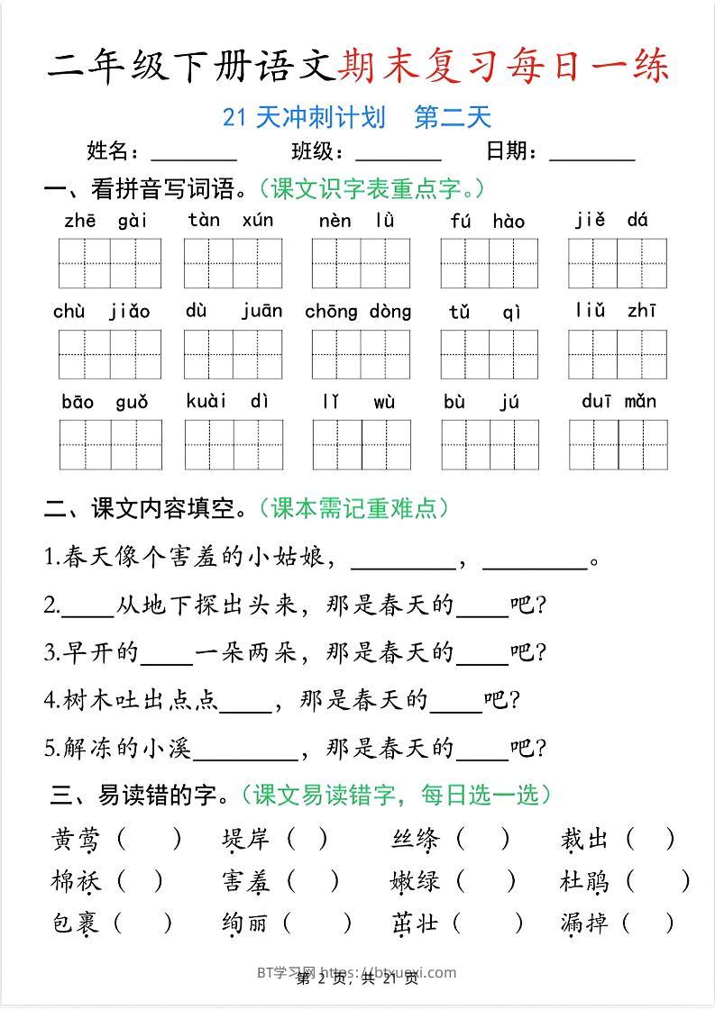 二下语文期末复习每日一练21天冲刺计划(21页)超级管理员25年5月26日发布关注私信034913 ——预览已结束,还剩19页未读——开通会员后可免费下载高清完整文档 © 版权声明文章版权归作者所有,转载请注明来源,未经允许请勿转载。本站内容均来自用户投稿或网络公开收集,本站只做展示,不对内容真实性负责。THE END小学语文 喜欢就支持一下吧点赞13 分享QQ空间微博QQ好友海报分享复制链接收藏