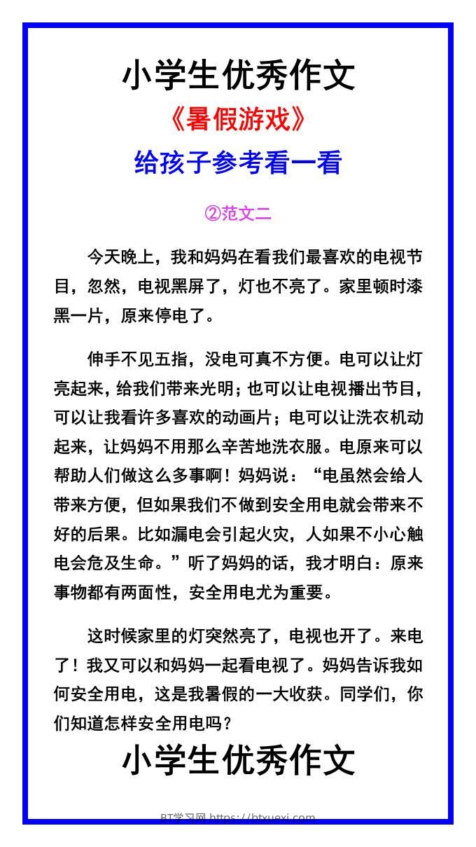 小学生优秀作文《暑假游戏》范文汇总-小升初语文超级管理员25年7月3日发布关注私信017713 ——预览已结束,还剩1页未读——开通会员后可免费下载高清完整文档 © 版权声明文章版权归作者所有,转载请注明来源,未经允许请勿转载。本站内容均来自用户投稿或网络公开收集,本站只做展示,不对内容真实性负责。THE END小升初 喜欢就支持一下吧点赞13 分享QQ空间微博QQ好友海报分享复制链接收藏