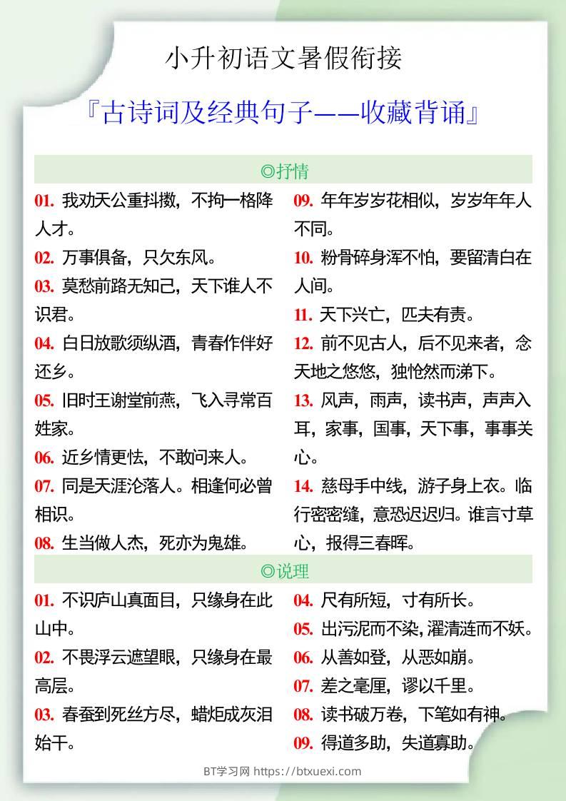 小升初语文暑假衔接之古诗词及经典句子-小升初语文超级管理员25年7月4日发布关注私信03856 ——预览已结束,还剩2页未读——开通会员后可免费下载高清完整文档 © 版权声明文章版权归作者所有,转载请注明来源,未经允许请勿转载。本站内容均来自用户投稿或网络公开收集,本站只做展示,不对内容真实性负责。THE END小升初 喜欢就支持一下吧点赞6 分享QQ空间微博QQ好友海报分享复制链接收藏