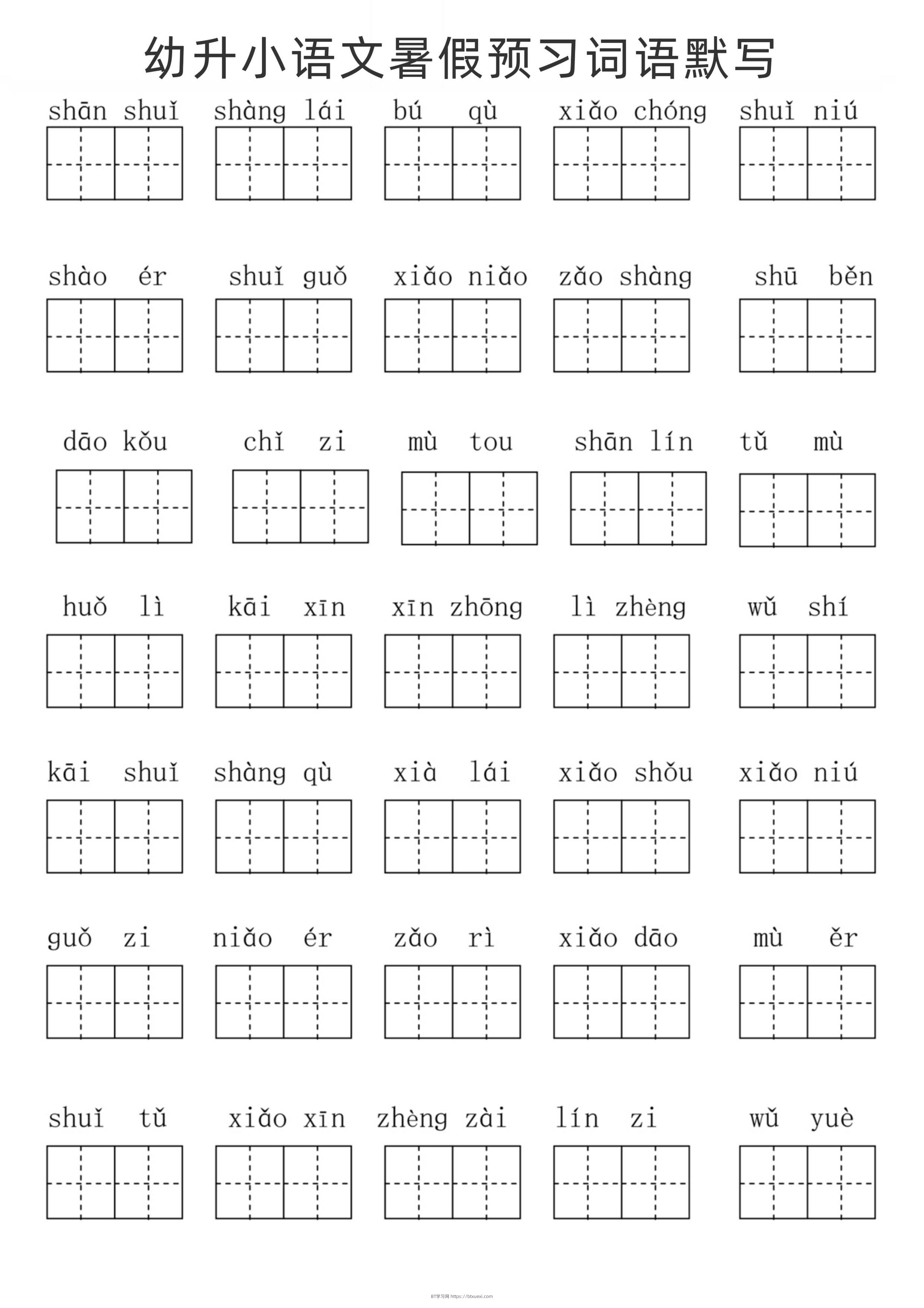 幼升小语文暑假预习词语默写超级管理员25年7月21日发布关注私信028911 ——预览已结束,还剩4页未读——开通会员后可免费下载高清完整文档 © 版权声明文章版权归作者所有,转载请注明来源,未经允许请勿转载。本站内容均来自用户投稿或网络公开收集,本站只做展示,不对内容真实性负责。THE END幼升小 喜欢就支持一下吧点赞11 分享QQ空间微博QQ好友海报分享复制链接收藏
